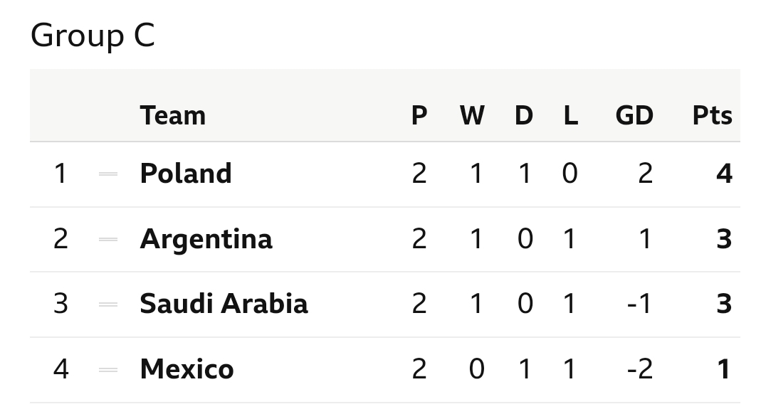 በምድቡ መጀመሪያ ጨዋታ ሳውዲ አረቢያ አርጀንቲናን 2 ለ 1 ስታሸንፍ ፖላንድና ሜክሲኮ ያለምንም ግብ አቻ ተለያይተዋል ።