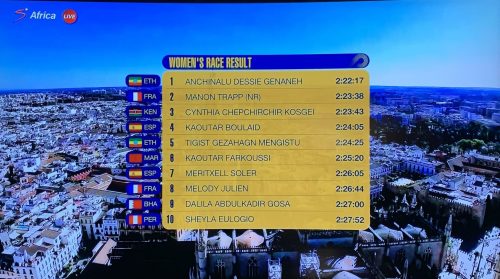 በሌላ በኩል በሴቶቹ ዘርፍ የሲቪያ ማራቶን ውድድርም የመጀመሪያ የማራቶን ተሳትፎን ያደረገችው አንቺንአሉ ደሴ 2:22:17 በመግባት ውድድሩን አሸንፋለች።