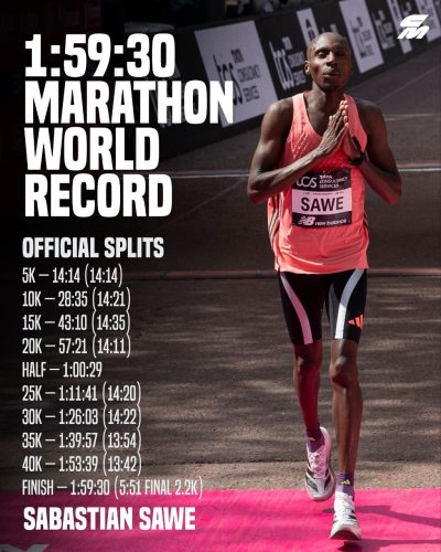ሳዌ እስከ 25 ኪሎ ሜትር ድረስ አሯሯጮች (pacers) የነበሩት ቢሆንም፣ አሯሯጮቹ ከወጡ በኋላ ግን በበለጠ ፍጥነት ሮጧል። የመጀመሪያውን ግማሽ ማራቶን በ60፡29፣ ሁለተኛውን ደግሞ በ59፡01 አጠናቋል ። ይህም በማራቶን ታሪክ ፈጣኑ የሁለተኛ አጋማሽ ሩጫ ሆኗል። ቀደም ሲል ፈጣኑ የነበረው ኬልቪን ኪፕቱም በ2023 ለንደን ማራቶን ያስመዘገበው 59፡45 ነበር ። በአጠቃላይ የመጨረሻውን 12.195 ኪሎ ሜትር በየማይሉ በአማካይ በ4፡24.3 ፍጥነት (በ1፡55፡30 የማራቶን ፍጥነት) ሮጧል።